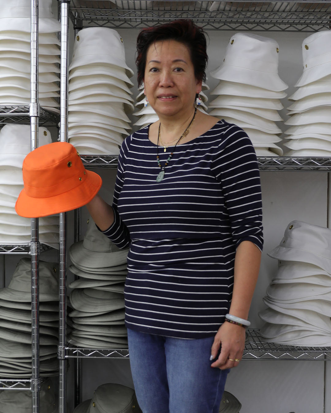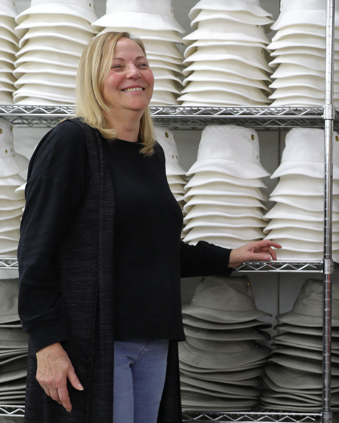 Standing proudly next to a fresh batch of Made in Canada hats, our Plant Manager Judy runs a symphony of 23 pairs of skilled hands for every hat. She's been with us for over 30 years and is woven into the fabric of Tilley.