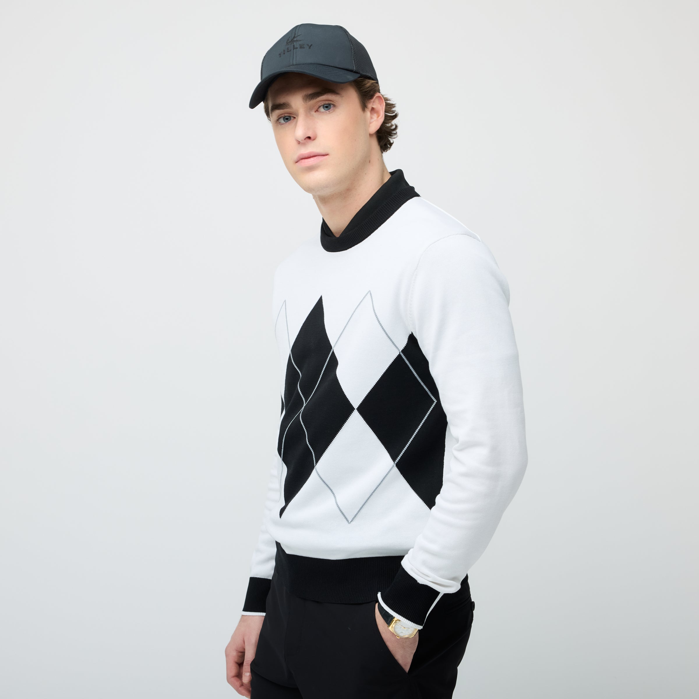 The Men’s Argyle Classic Crew Sweater features a regular fit with a bold, oversized argyle pattern across the front for a refined yet sporty look. The crew neckline and ribbed trims keep the silhouette clean, while a small embroidered bird logo at the back neck adds a subtle signature detail. Soft, comfortable, and easy to layer, this sweater delivers a classic golf aesthetic updated with modern versatility.