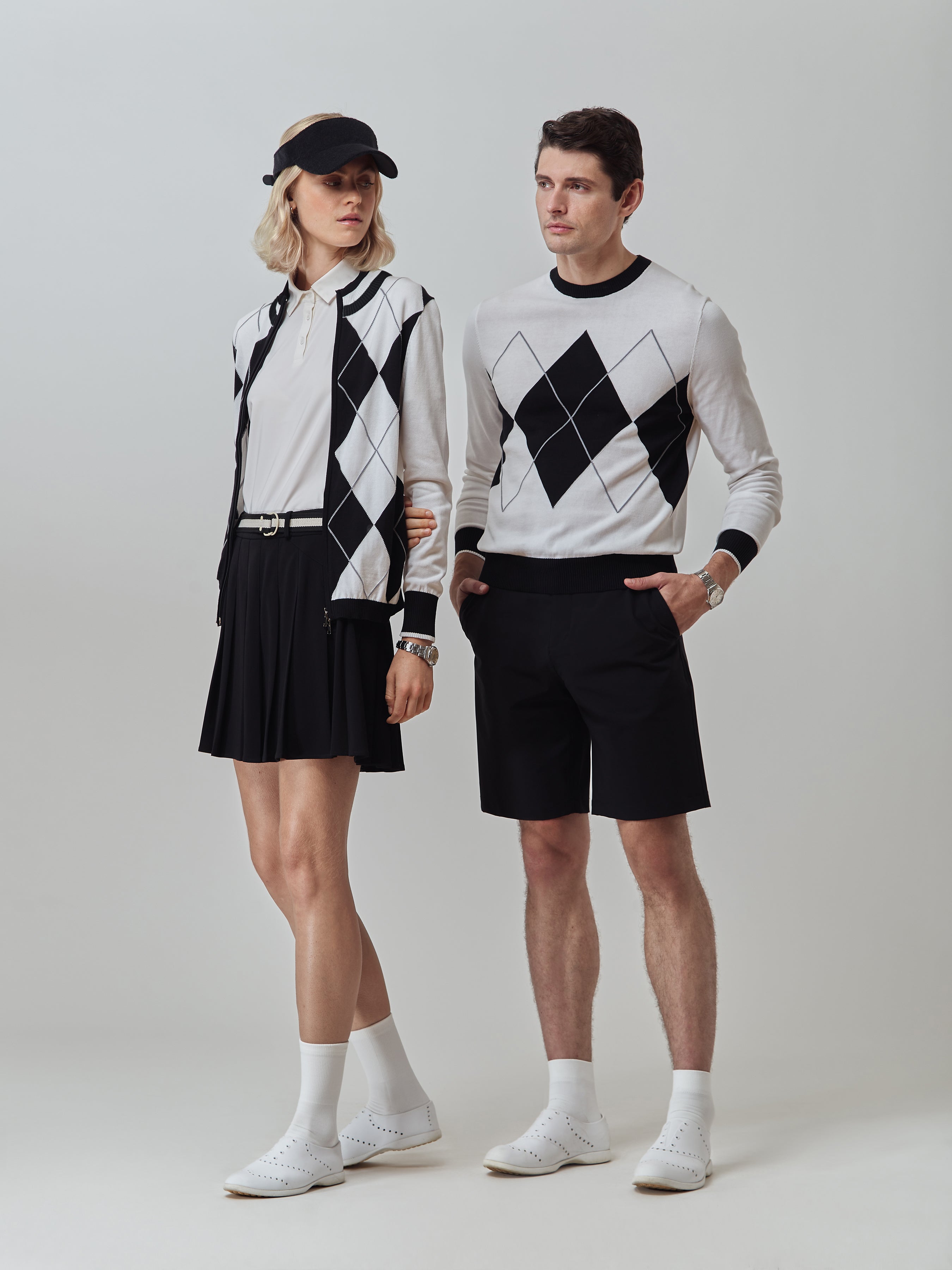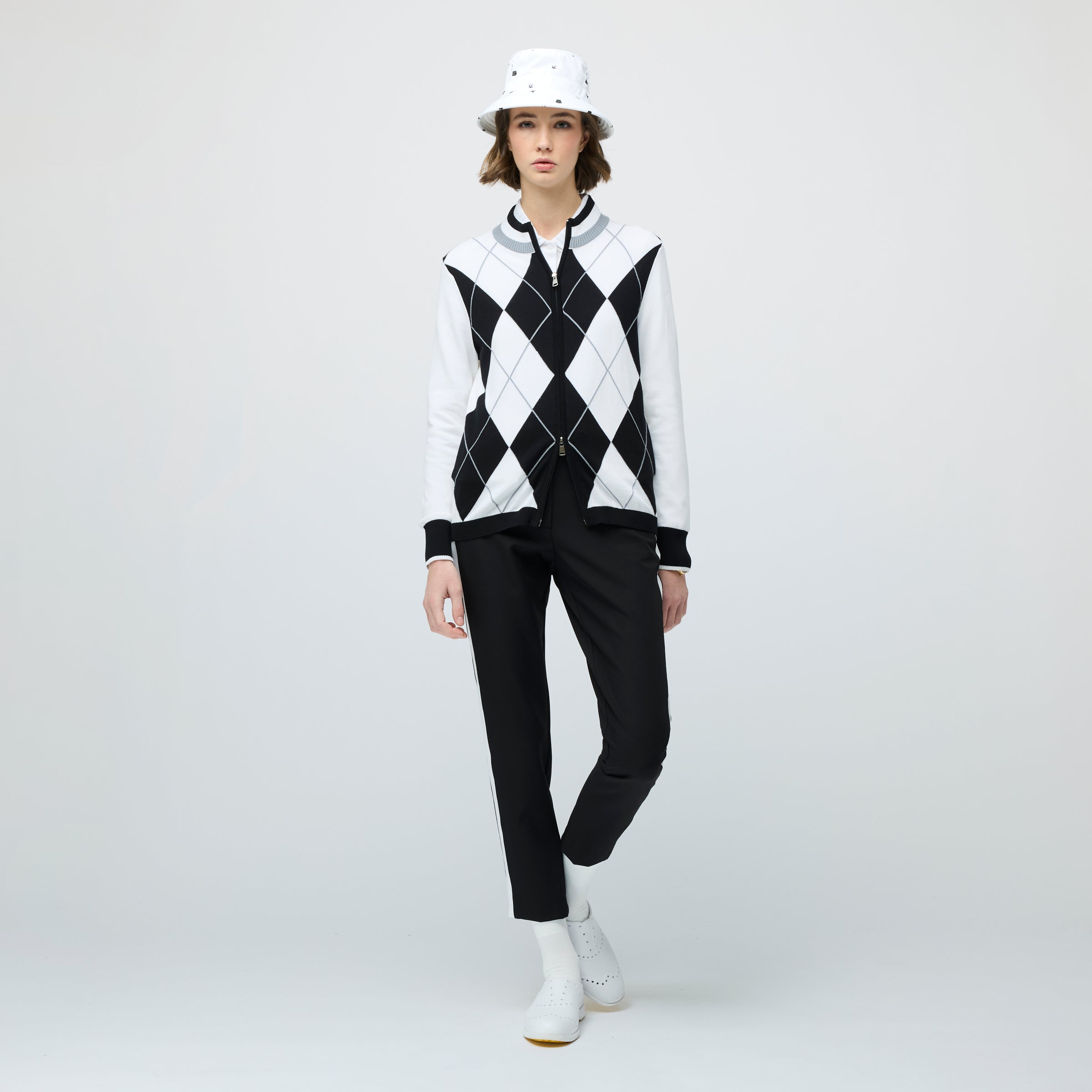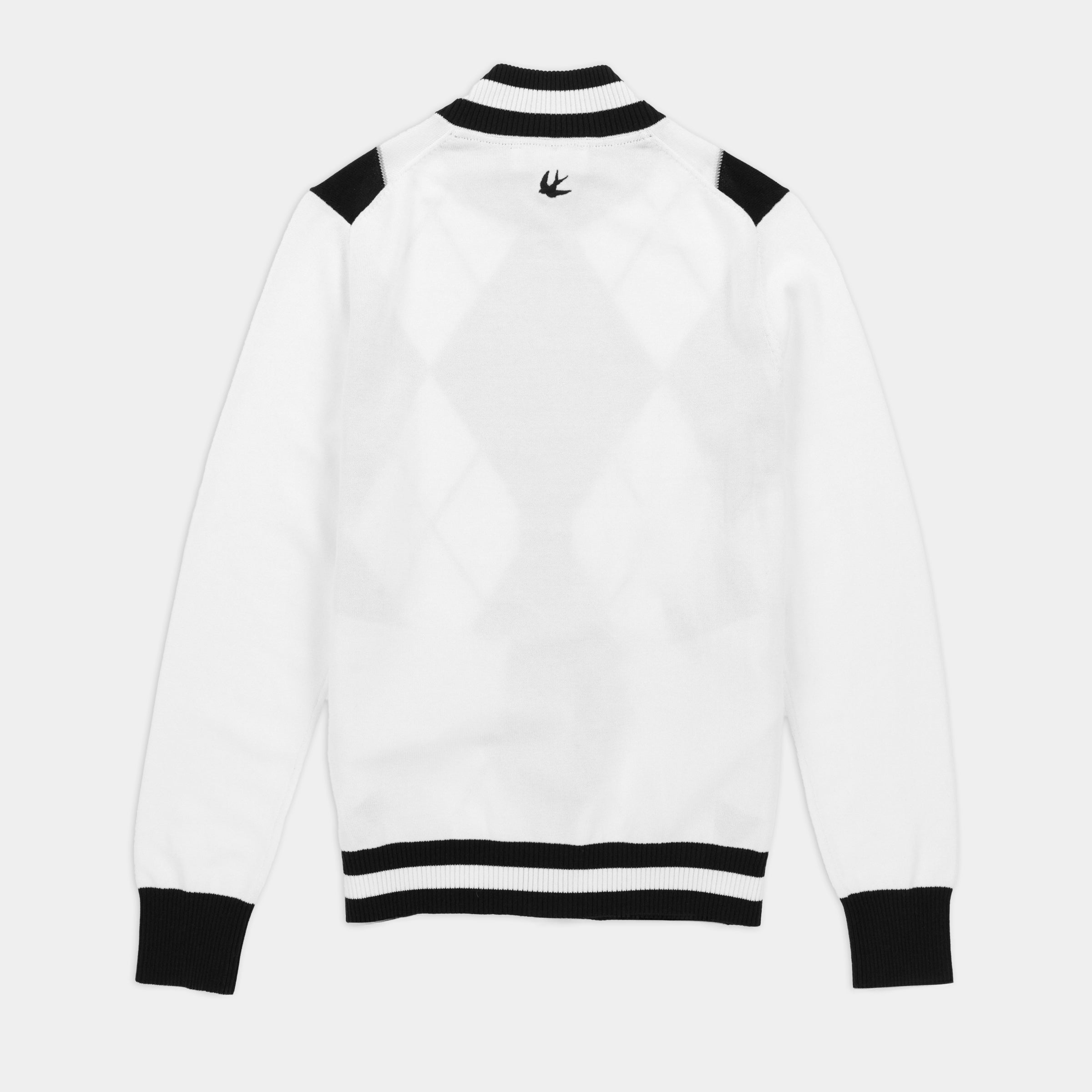 The Women’s Argyle Full Zip Sweater features a bold argyle pattern on the front with a clean solid back, giving it a refined preppy look. The mock neck and bottom band are finished with contrast stripe detailing, paired with contrast cuffs for a polished touch. A two-way zipper adds versatility and ease of wear, while a small contrast embroidered bird below the back neckline offers a subtle signature accent. Comfortable, sporty, and easy to layer, it brings modern function to a classic golf silhouette.